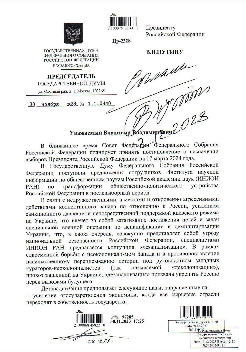 Відповідний лист датований 30 листопада 2023 року, що показує – у переобранні Владіміра Путіна ніхто не сумнівається – ще наприкінці минулого року влада формувала плани на післявиборчий період.