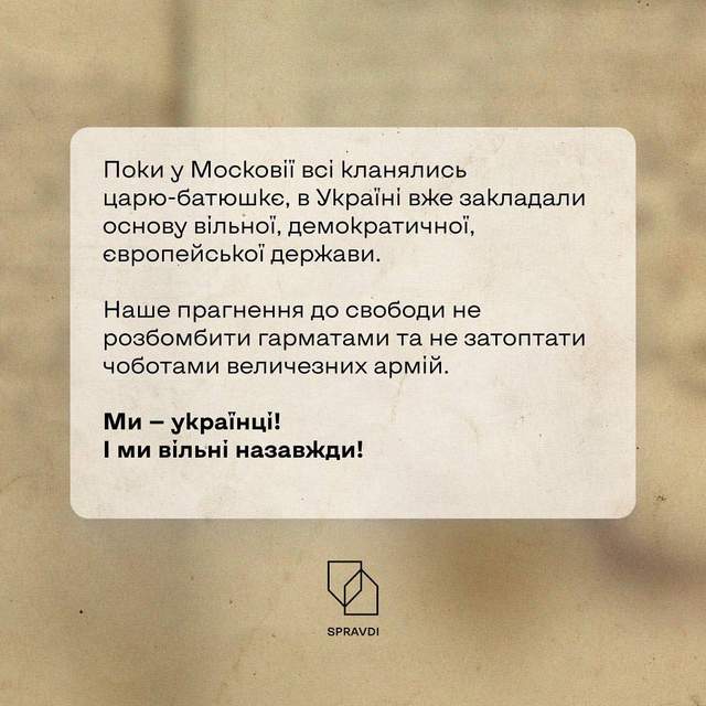 Міністерство культури та інформаційної політики та SPRAVDI нагадали, що поки в Москві поклонялись царю, Україна вже заклала основи суверенної, вільної та цивілізованої країни.