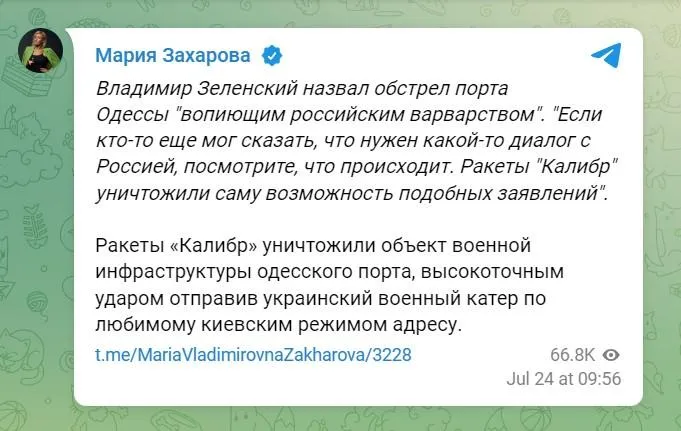 Як заявила речниця МЗС країни-агресорки, "Калібр" знищили об'єкт військової інфраструктури одеського порту.