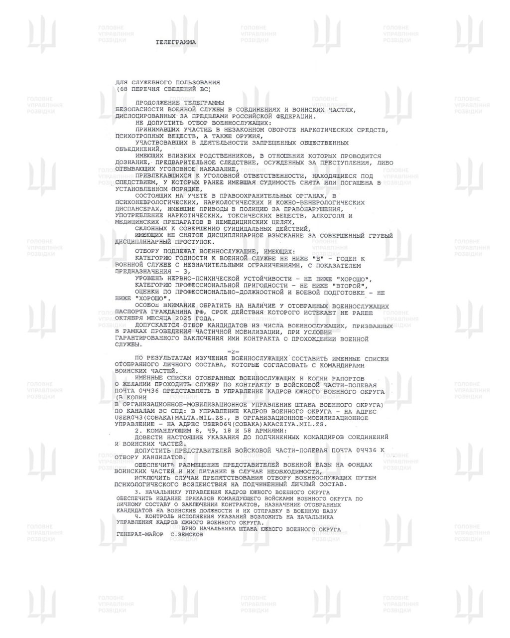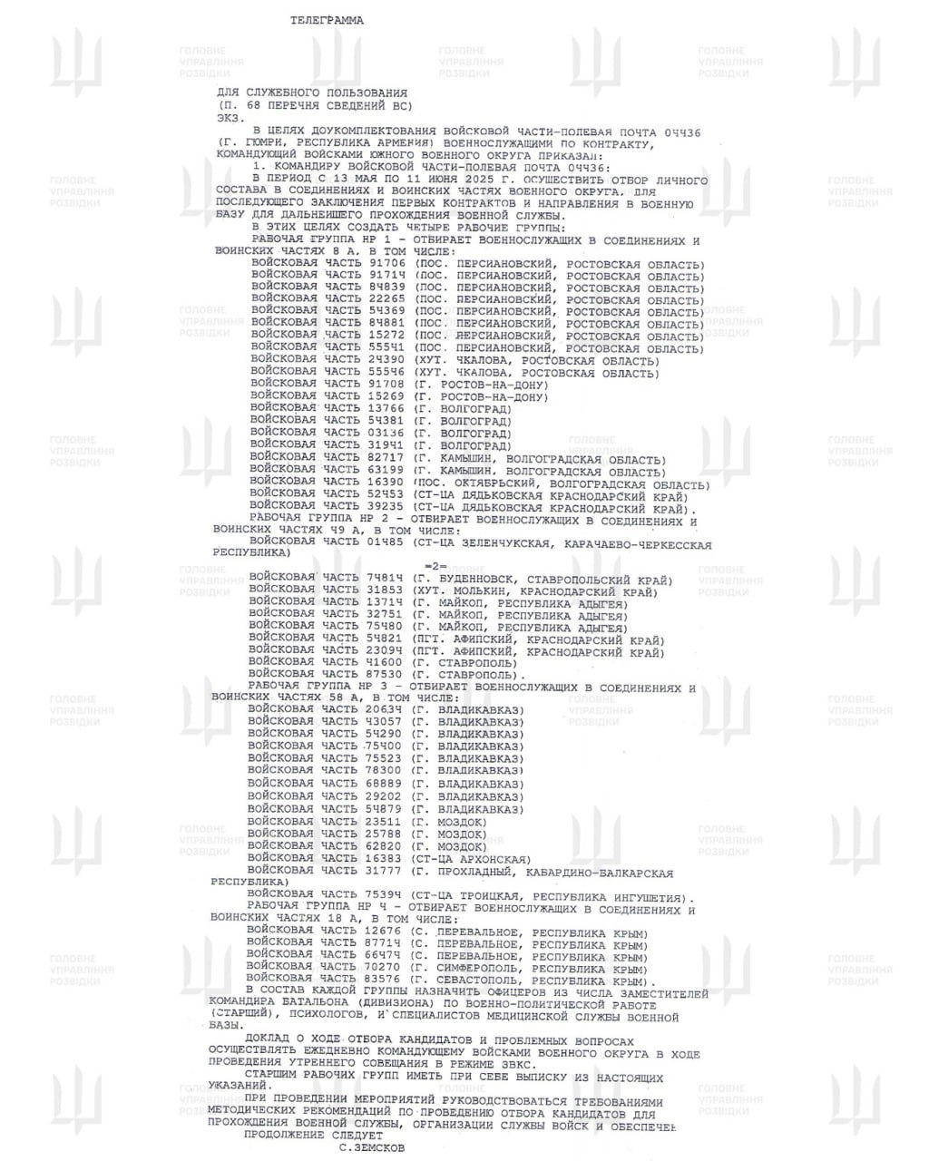 У документі вказано відібрати бійців з 8-ї, 18-ї, 49-ї та 58-ї загальновійськових армій Південного військового округу. Командирам визначених підрозділів наказано всіляко сприяти проведенню відбору кандидатів для проходження служби в Ґюмрі.