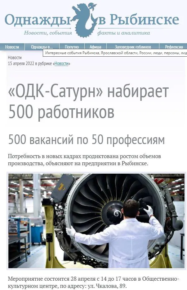У місті Рибинськ Ярославської області є завод "ОДК-Сатурн", на якому виробляють двигуни для ракет "Калібр". І от раптом цей завод починає шукати до 500 нових працівників – шукають як інженерів, так і звичайних робітників.
