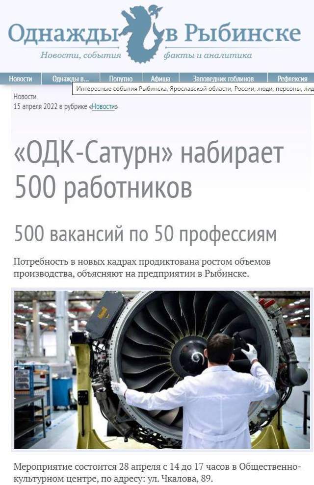 У місті Рибинськ Ярославської області є завод "ОДК-Сатурн", на якому виробляють двигуни для ракет "Калібр". І от раптом цей завод починає шукати до 500 нових працівників – шукають як інженерів, так і звичайних робітників.