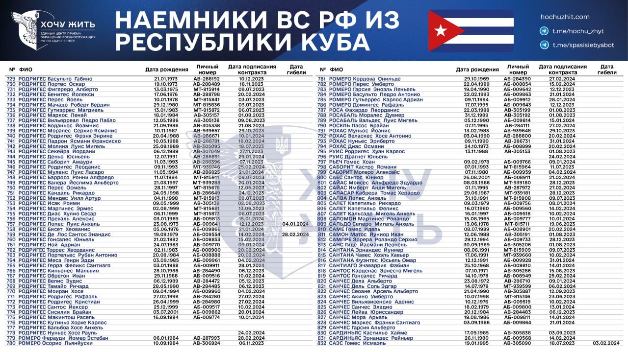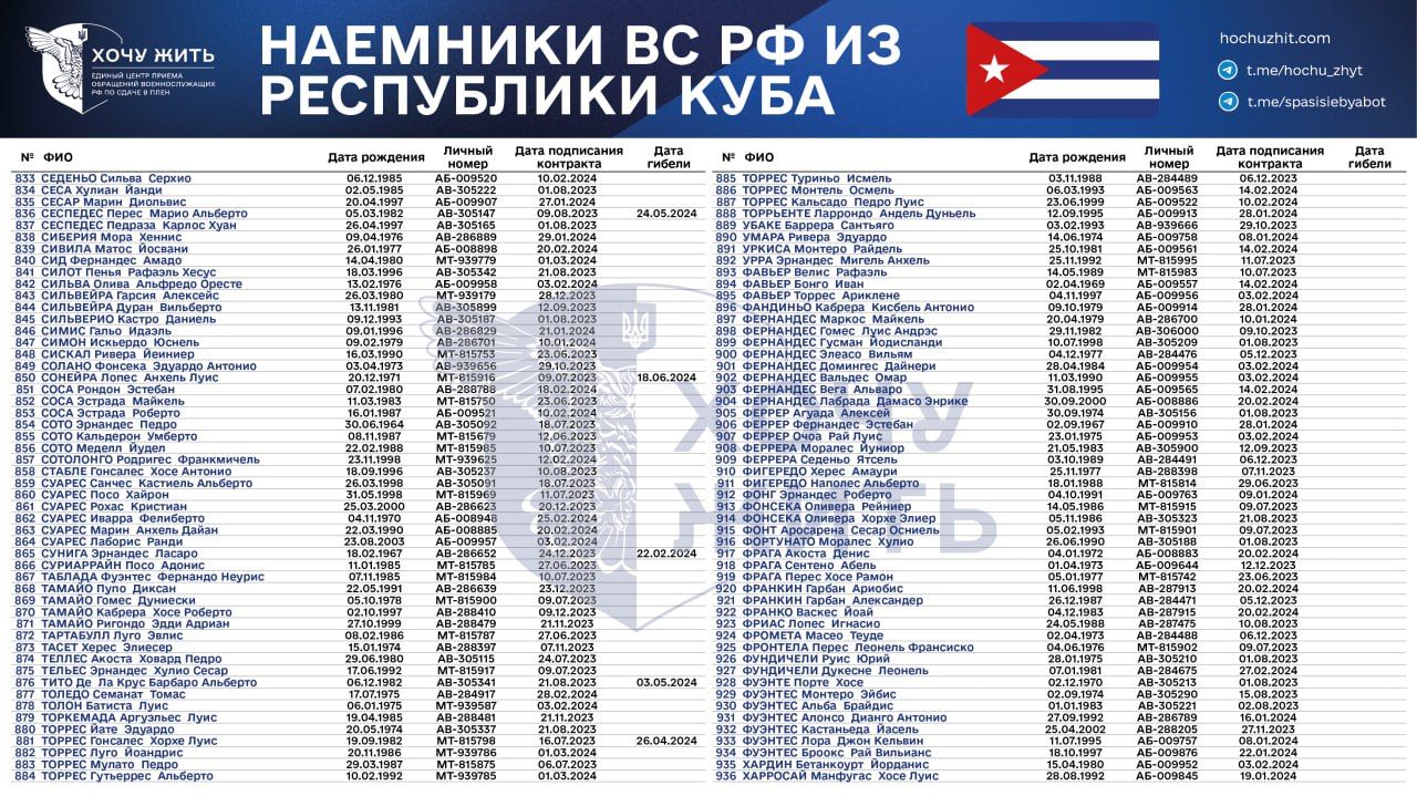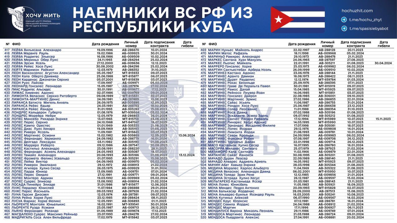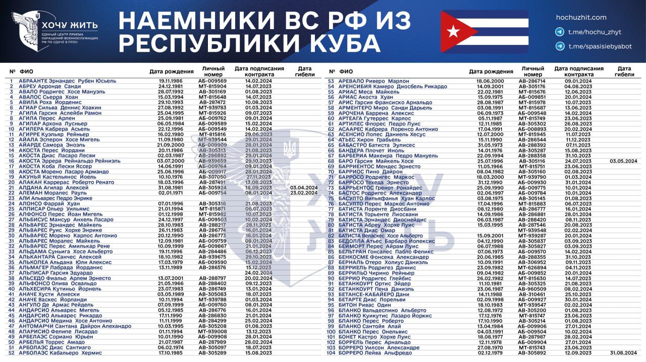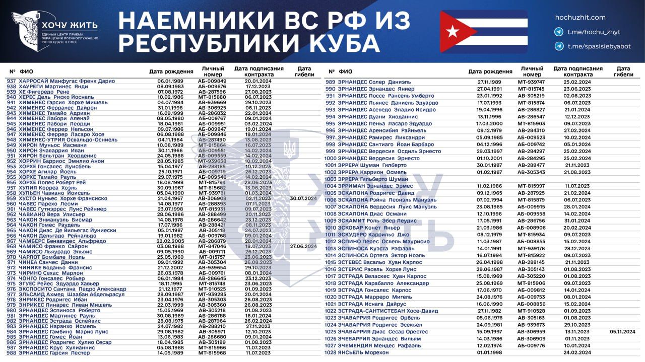 Нам достовірно відомі імена та особисті дані 1028 кубинців, які підписали контракт зі Збройними силами Росії у 2023 – 2024 роках,