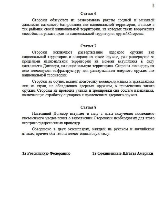 - Росія та США зобов'язуються розвивати ядерне озброєння лише на своїй території. Усю наявну зброю за кордоном необхідно повернути. А інфраструктуру для розгортання ядерного озброєння на інших територіях – ліквідувати.