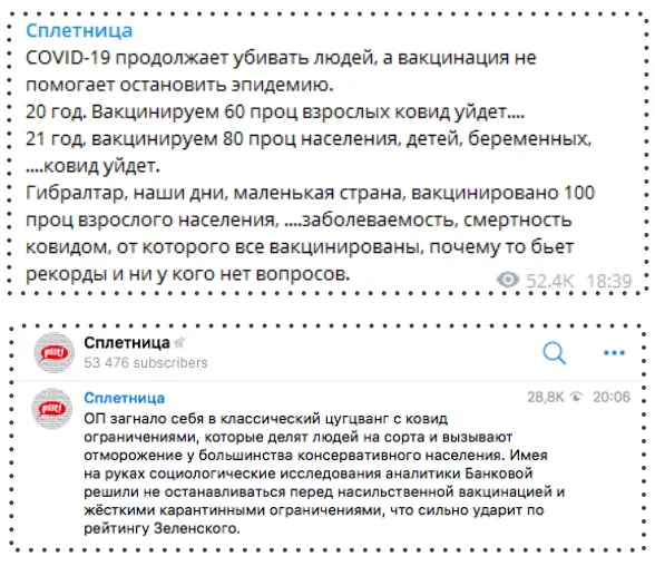 Усі ці канали адмініструють в Росію. Цю інформацію підтвердили також у Службі безпеки України. Цікаво, що на території Росії поширюють зовсім інші наративи – там закликають людей щепитися від COVID-19.