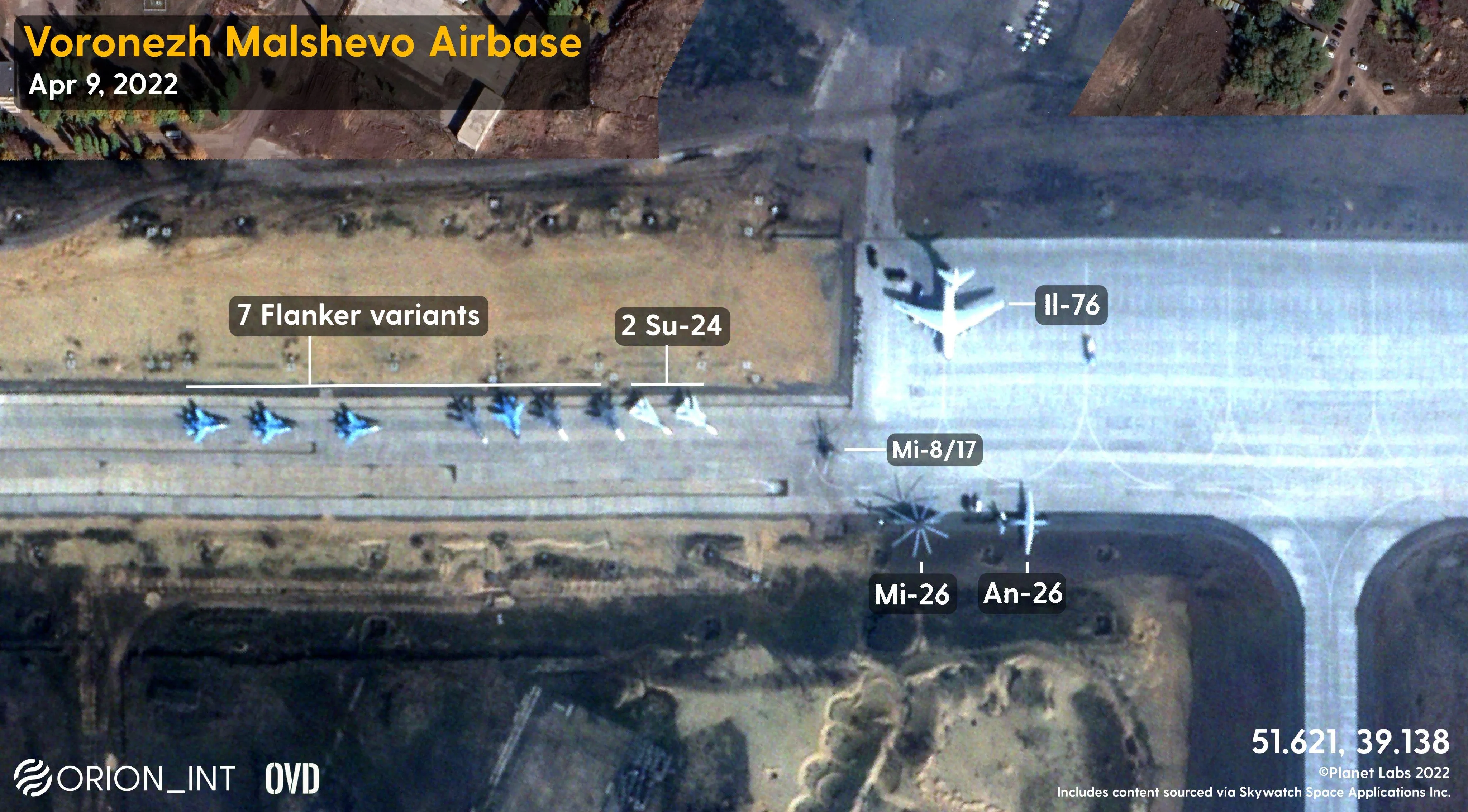В мережі опублікували супутникові знімки за 9 квітня аеродрому у Воронежі. На фотографії потрапили щонайменше 32 винищувачі Су-27 (за класифікацією НАТО – Flanker), а також два Су-24.