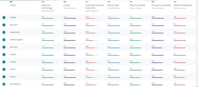 Як пише Independent, загальний рейтинг вираховували за балами в кожній з семи категорій: наука і технології, культура, міжнародний мир і безпека, світовий порядок, планета і клімат, процвітання і рівність, здоров'я і добробут.