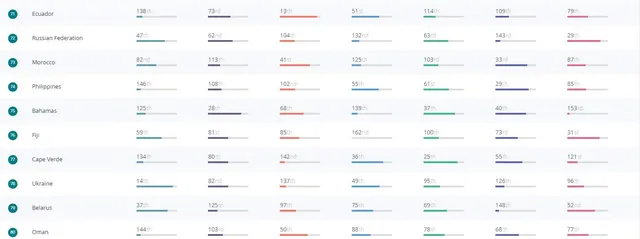 Росія випередила Україну на шість сходинок, зайнявши 72 місце. Найгірше експерти оцінили в цій країні ставлення до світового порядку (132), а також процвітання і рівність громадян (143).