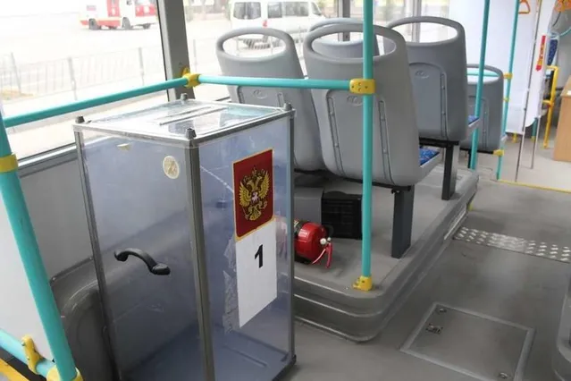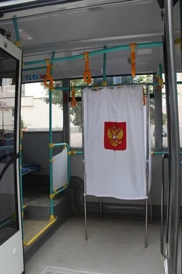 Автобуси для голосувань обладнані кабіною та урнами для бюлетенів. Такі автобуси стоять біля кожної виборчої дільниці у Сімферополі.