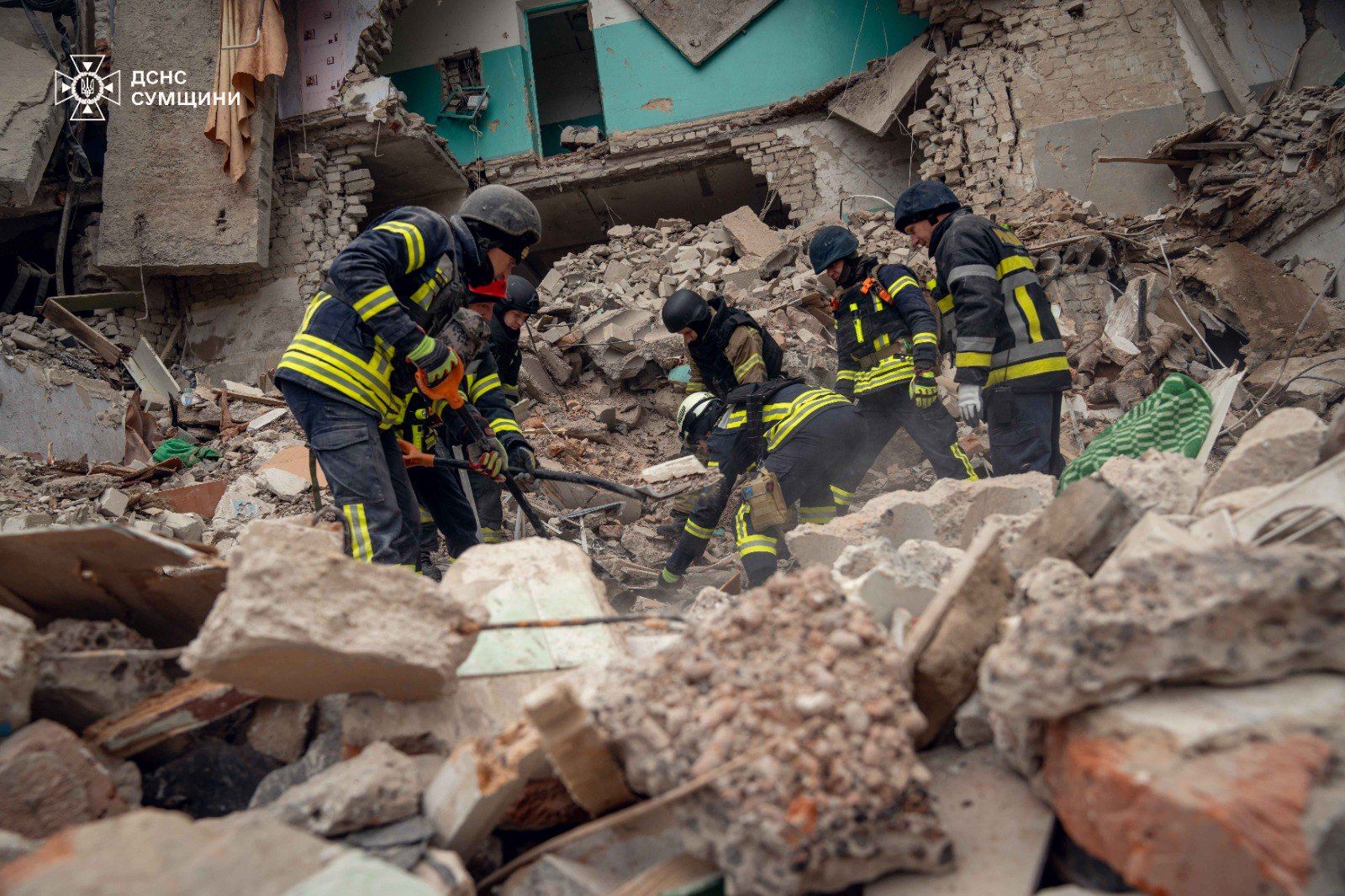 У ДСНС повідомили, що, станом на 13:10 внаслідок ворожої атаки по гуртожитку в Глухову загинуло 12 людей, з них 1 дитина.