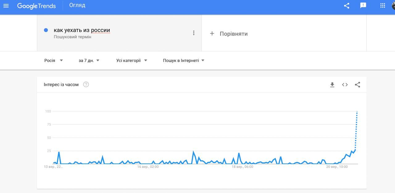 Про це свідчать актуальні дані індексу запитів у Google, повідомляє 24 канал. Лише за вівторок, 20 вересня, запит "Як виїхати з росії" досяг максимуму.