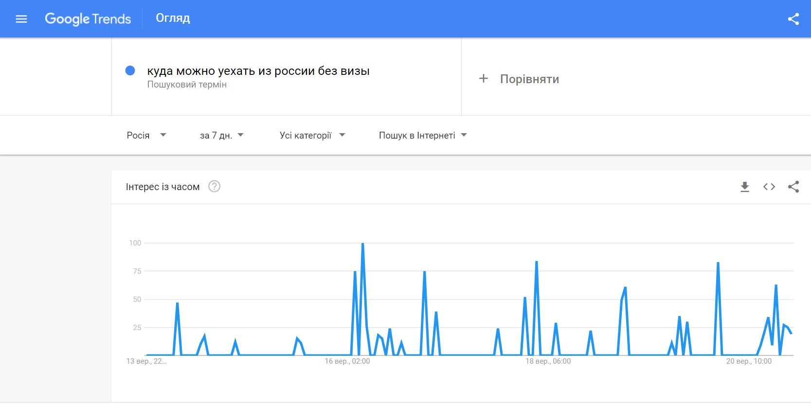 Очевидно, що сталося це на тлі новин про майбутню мобілізацію та "референдуми" в невизнаних республіках. Як виходить із даних Google Trends, пік запитів припав на 18:00. Найбільше гуглили те, як виїхати з росії мешканці Хабаровського краю, що межує з Китаєм.