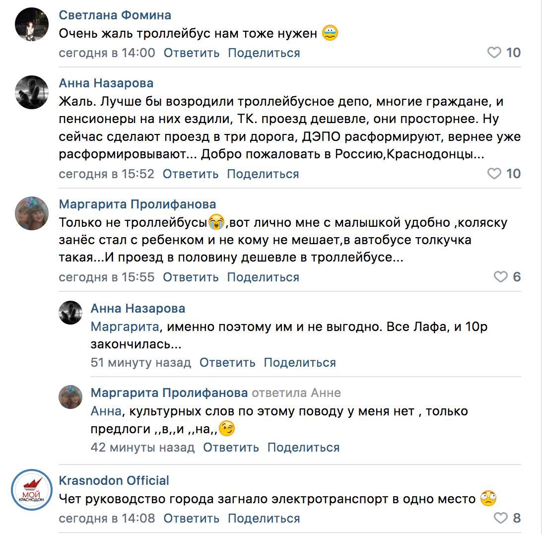 Особливо мені подобається, як у пості про закриття сорокинського тролейбуса моральні потвори пишуть "час не стоїть на місці й нікого не жаліє". Він й у Сєвєродонецьку не стояв на місці, му*аки! Але за України там випускали на лінії нові сучасні тролейбуси. А ви все знищили.
