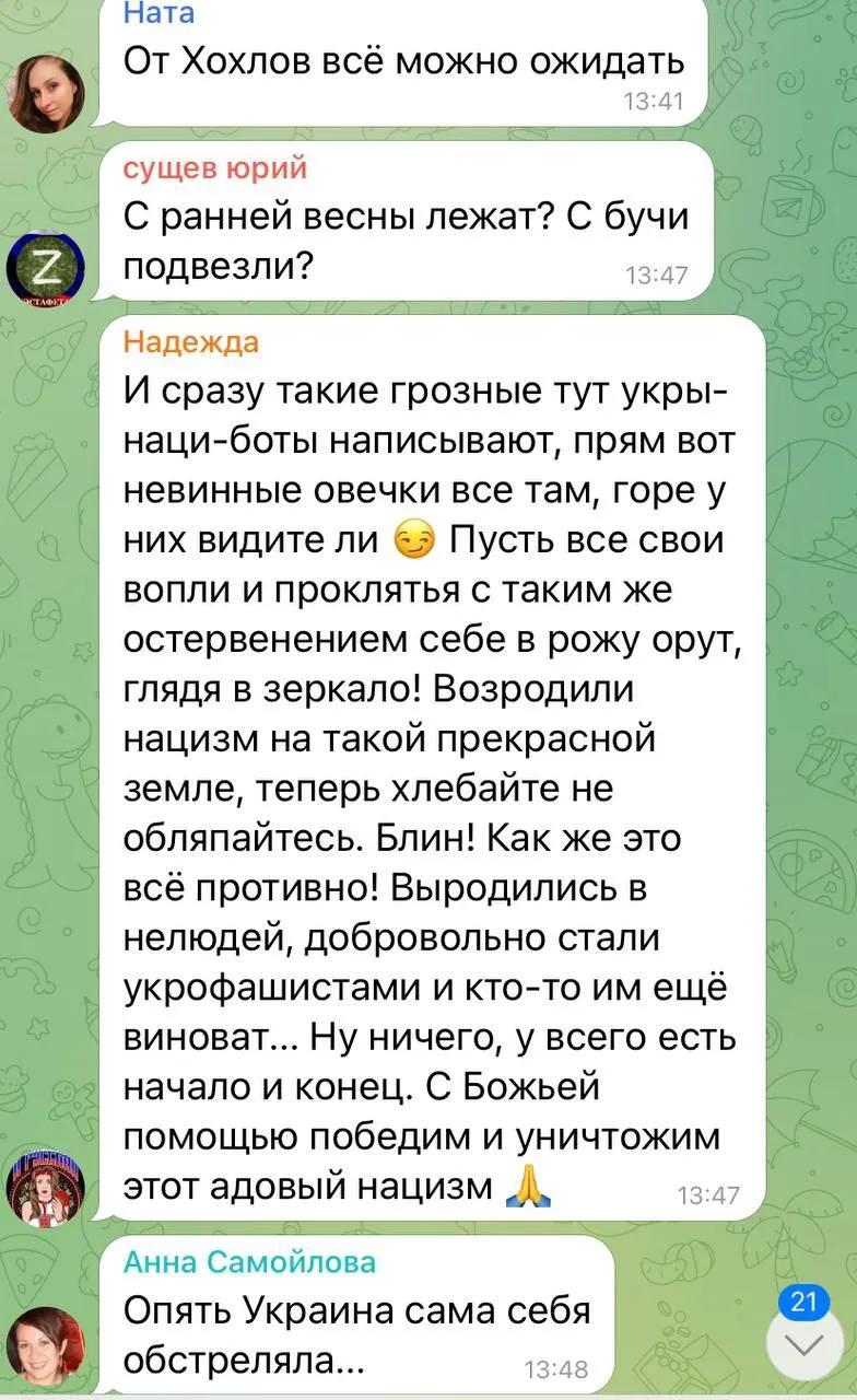 І ні, в нас не було сумнівів, що вина за тероризм, який скоює путінський режим в Україні – це вина кожного росіянина, але подібні коментарі переходять усі межі адекватності. Радіти смерті невинних людей – це вирок усій нації.