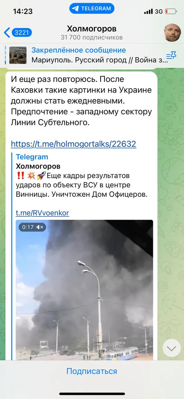 Хтось написав "укатайте їх всіх", "за 8 вінницьких трупів я зараз відкрию пляшечку шампанського", "такі атаки мають бути кожну годину", "слава путіну" й "за Нову Каховку".