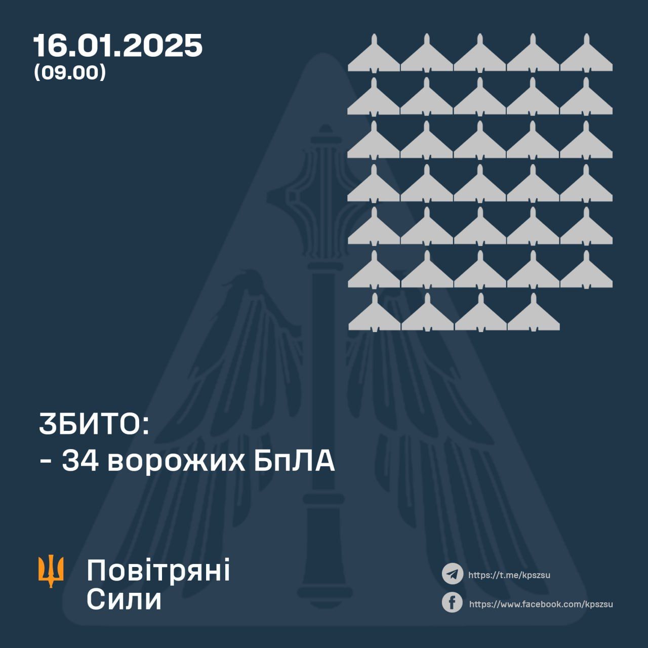 Станом на 09:00 підтверджено збиття 34-х ударних БпЛА типу "Шахед" та безпілотників інших типів у Полтавській, Сумській, Харківській, Черкаській, Чернігівській, Київській, Житомирській, Кіровоградській, Дніпропетровській, Запорізькій і Миколаївській областях,