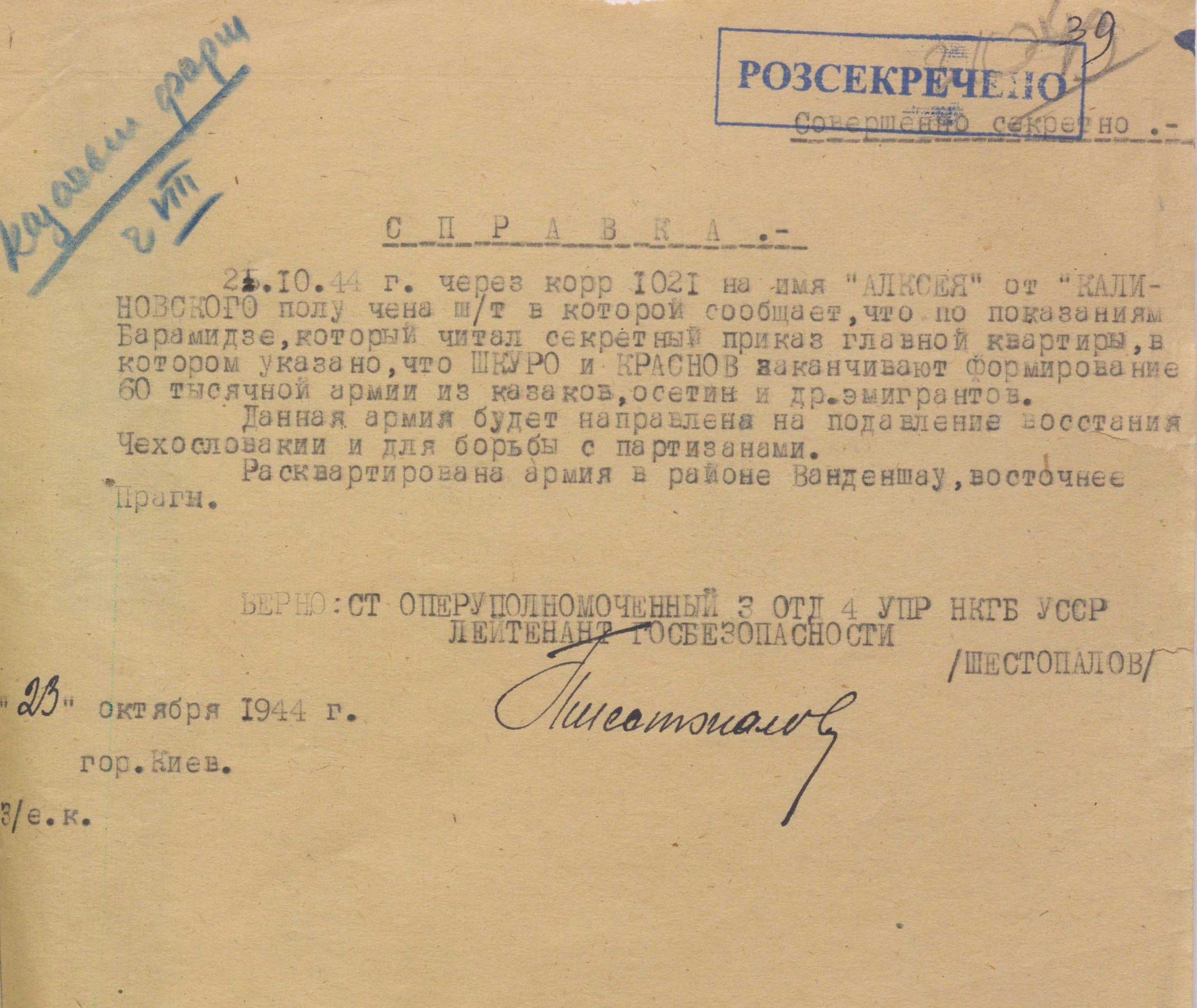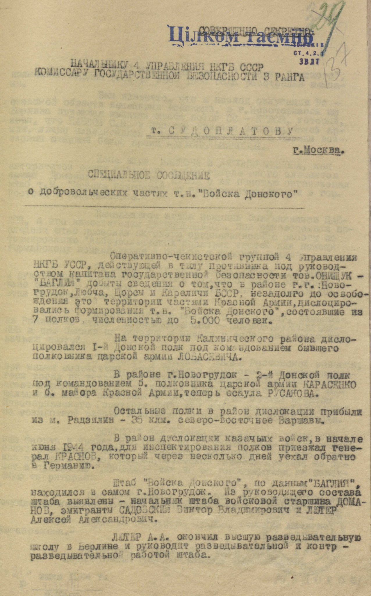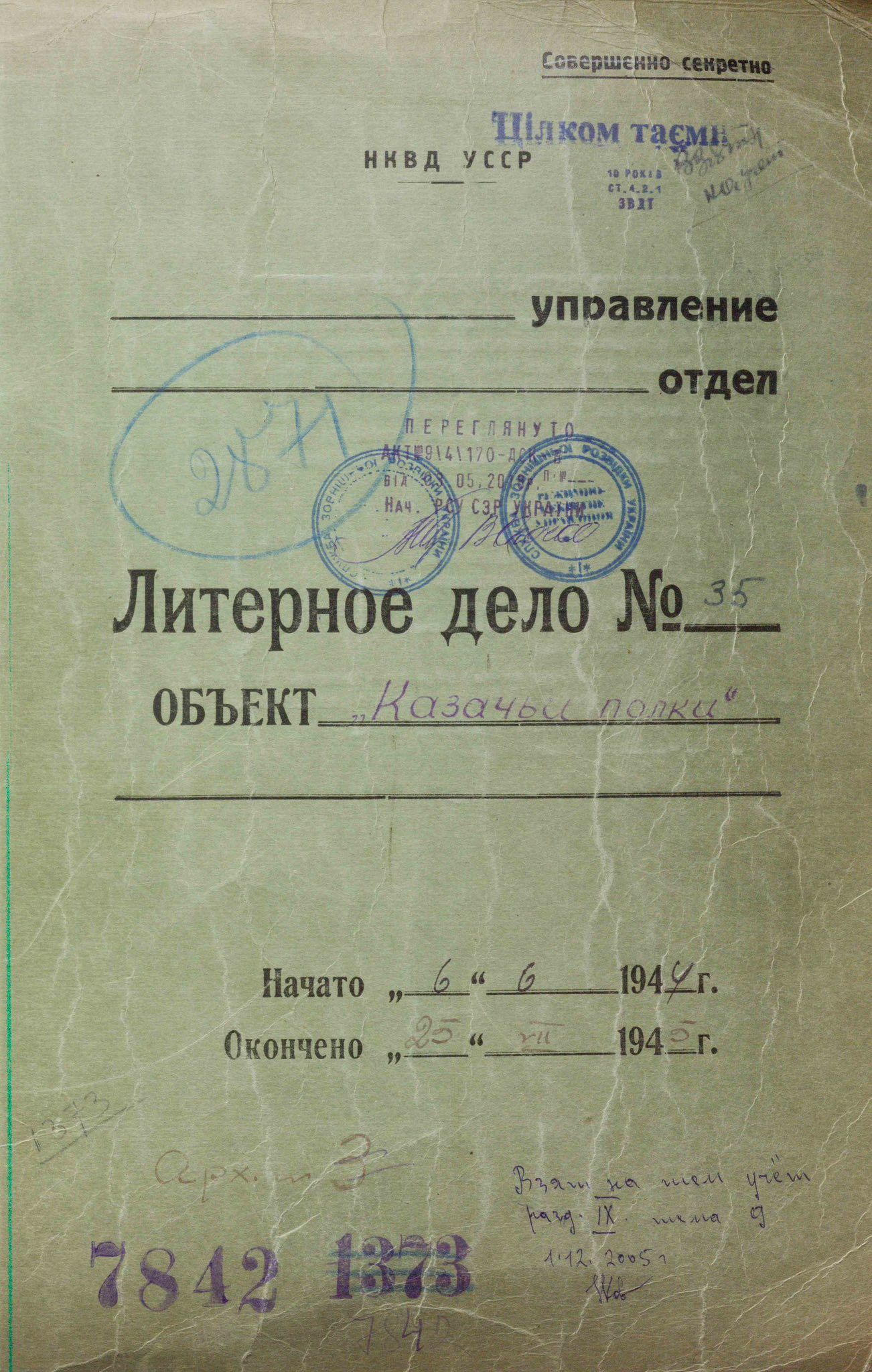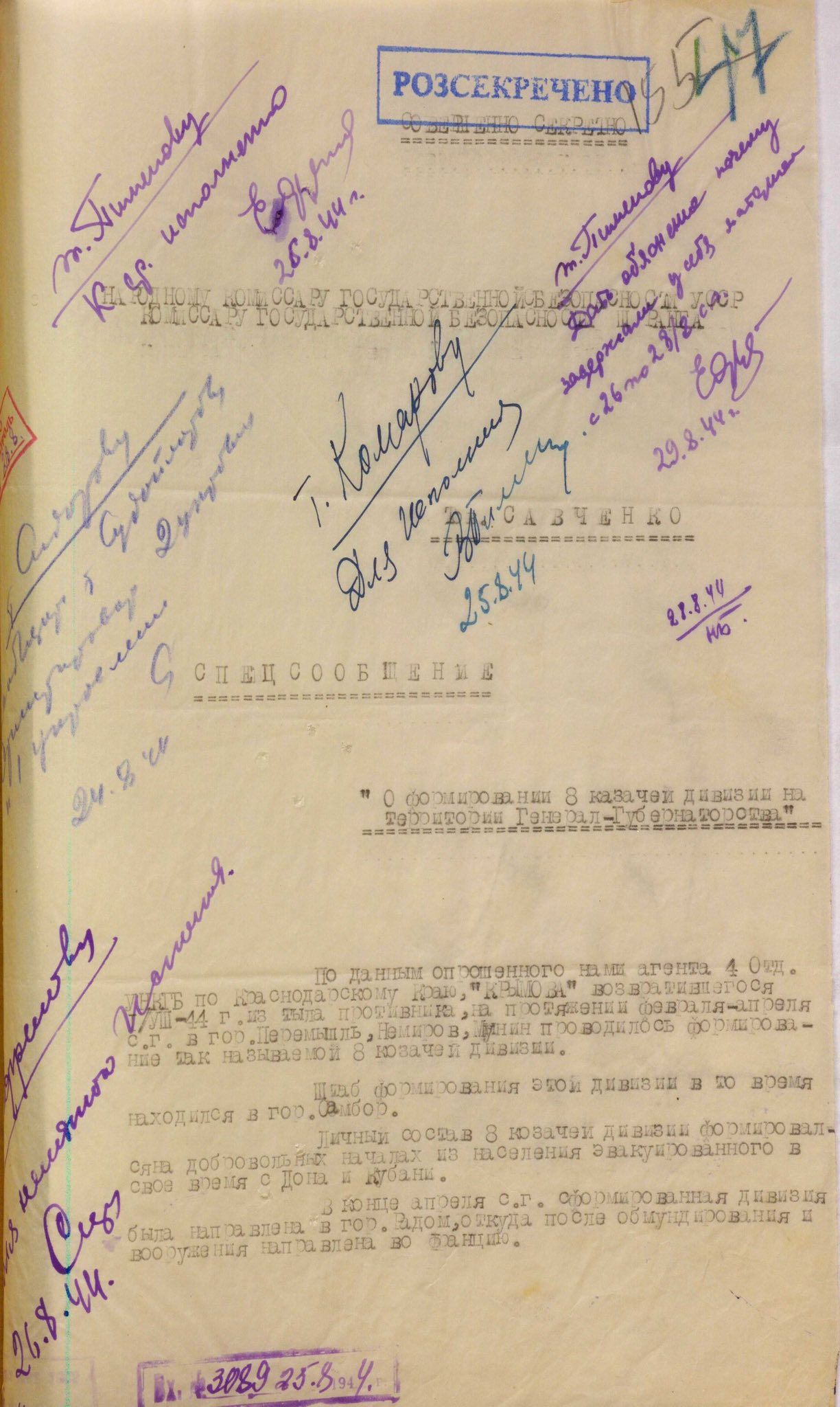 В архівних фондах СЗР зберігається літерна справа під назвою "Казачі полки". Вона була заведена в липні 1944 року 4-м (розвідувально-диверсійним) управлінням НКДБ УРСР.