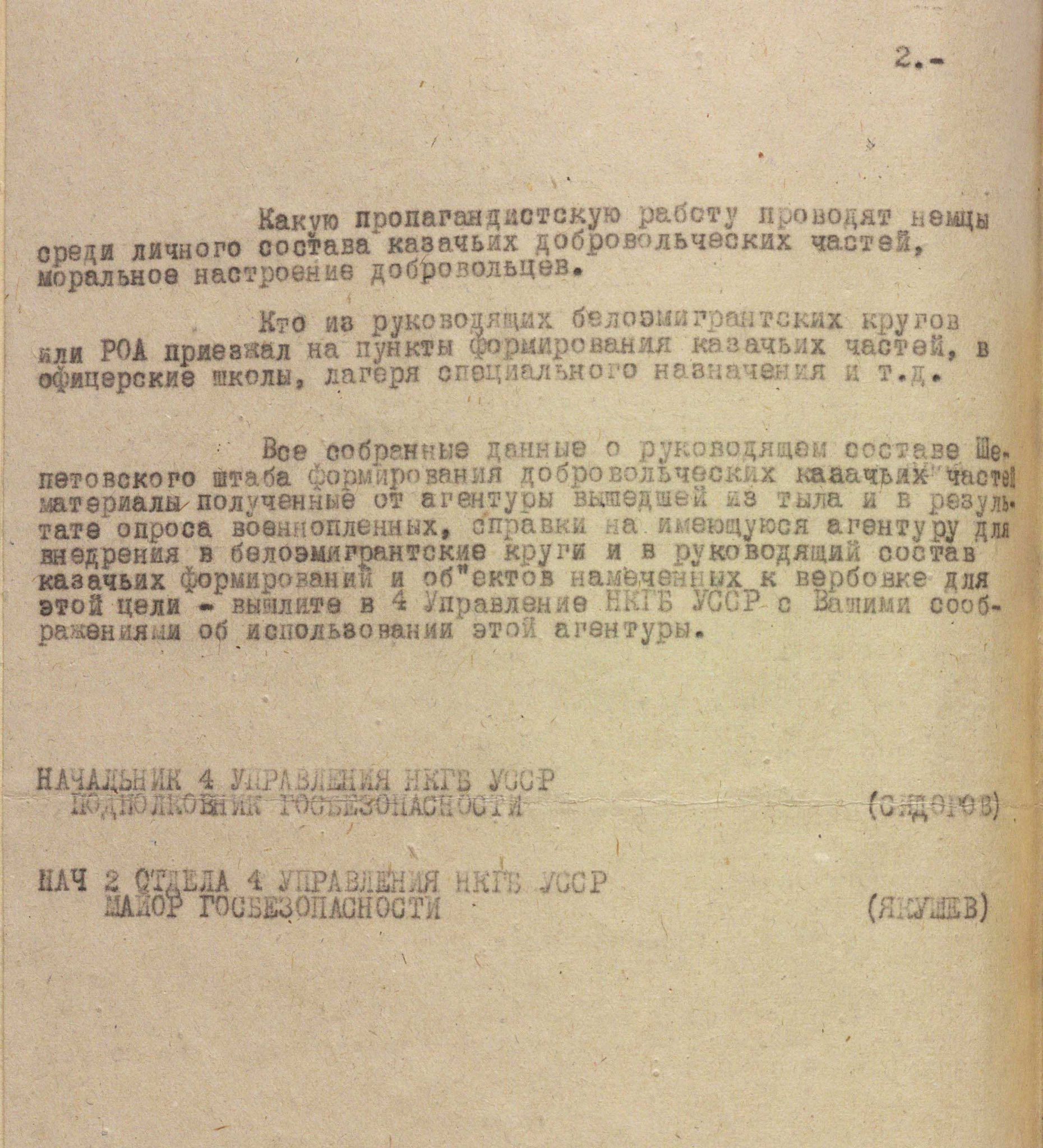 У постанові зазначалося, що накопичено певну кількість офіційних, агентурних та слідчих матеріалів про діяльність казачих частин, які формувалися гітлерівцями для боротьби проти червоної армії. Відтак ставилося завдання відстежувати процес пересування таких частин і впроваджувати в них чекістську агентуру,