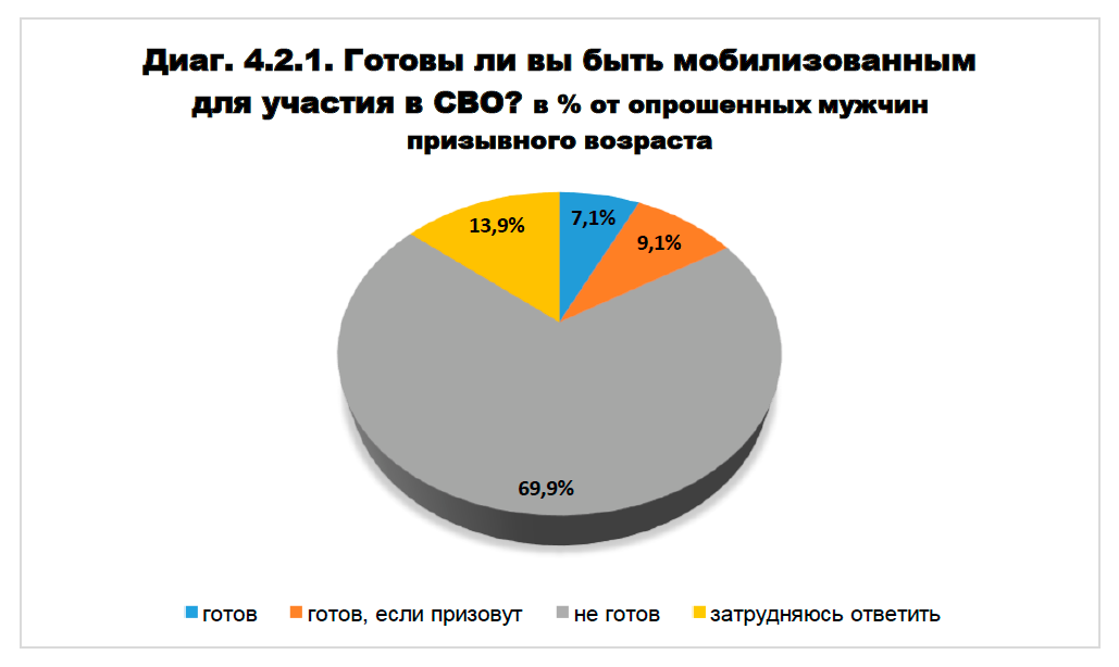 До речі, на війну в Україну готові вирушити тільки 7,1% чоловіків призовного віку, 9,1% кажуть, що підуть, якщо призвуть, 13,8% – важко відповісти.