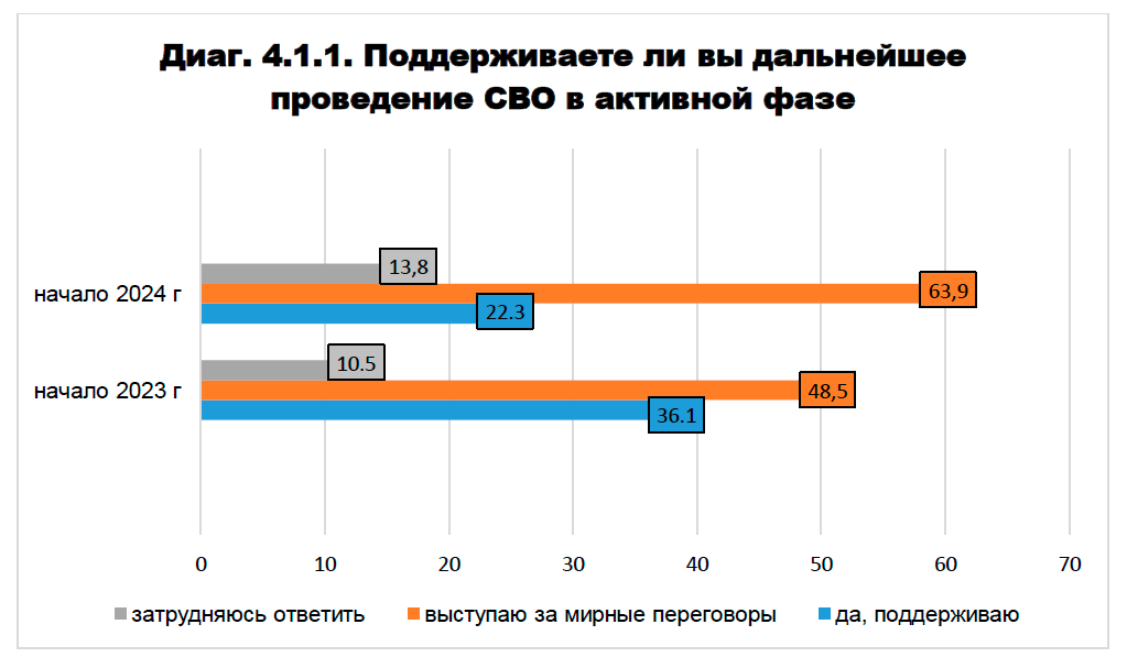 - 63,9% – виступають за проведення мирних переговорів. Це аж на 15,4% більше, ніж у 2023 році;