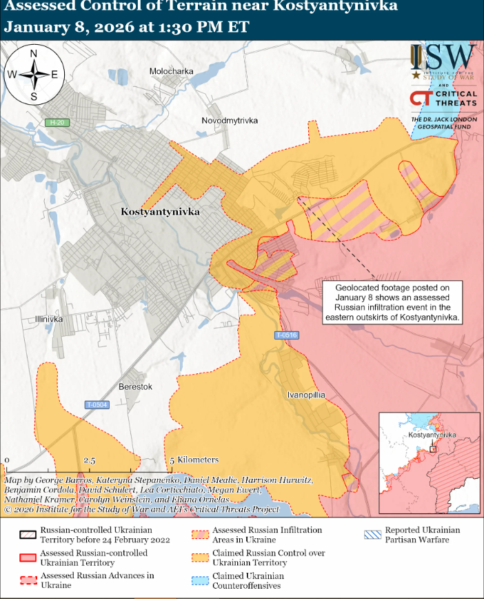 Окремо експерти уточнили ситуацію на Костянтинівському напрямку. Геолоковані відеокадри, опубліковані 6 січня, показують українські сили, що діють на південь від Костянтинівки – у районі, який начебто контролювали окупанти, за даними росЗМІ.