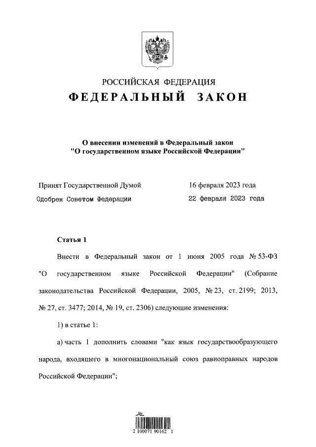 У відповідному документі зазначається, що при використанні російської мови як державної у сферах її обов'язкового застосування росіяни повинні дотримуватися норм сучасної російської мови. Під ними розуміється сукупність мовних засобів та правила їхнього використання, зафіксовані у нормативних словниках, довідниках та граматиках.