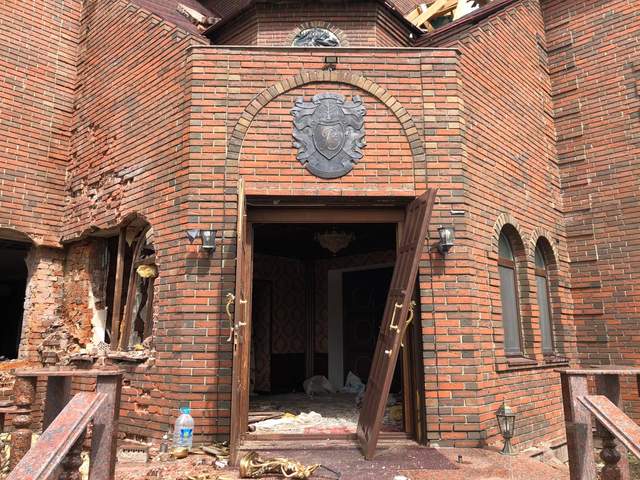 Над входом у будинок висить щось на кшталт кованого сімейного герба. По всій ділянці валяються залишки розбитих меблів, що нагадують реквізит до фільму "12 стільців", уламки канделябрів та статуеток "під старовину". Цікаво, хто тут мешкав?
