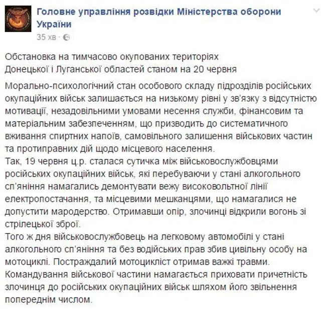 Також у понеділок п'яний бойовик на легковому авто та без водійських прав збив мирного жителя, який пересувався на мотоциклі. Внаслідок аварії чоловік отримав важкі травми, командування бойовиків намагається приховати причетність злочинця.