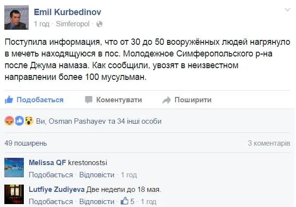 У коментарях до повідомлення Курбединова користувач висловив думку, що ця подія пов’язана з майбутніми роковинами депортації кримських татар, яку вони вшановують 18-го травня.