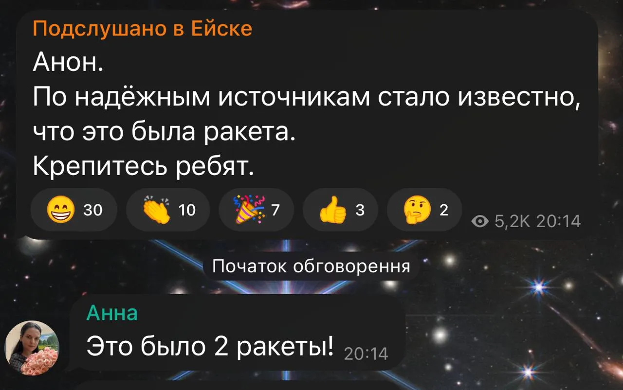 "За надійними джерелами стало відомо, що то була ракета. Тримайтесь, друзі", – написали згодом ресурси пропагандистів.