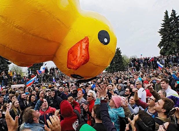 Из немосковских самый массовый и жестокий митинг прошел в Питере, где около десяти тысяч активистов, несмотря на запрет властей, пришли на Марсово поле. С собой они притащили гигантскую надувную утку. Эта птица стала символом коррупции в РФ, когда выяснилось, что Медведев построил на пруду у своего дома шикарный домик для уточек.