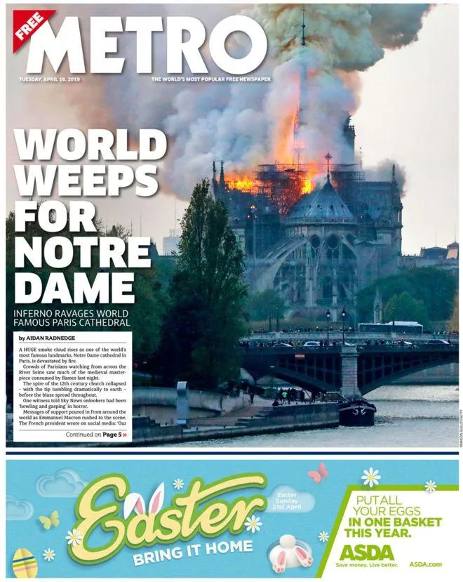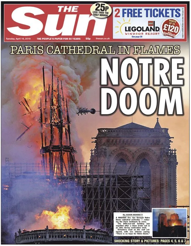 The Sun поряд із зображенням однієї зі зруйнованих башт собору розмістило заголовок: "Notre-Doom" (гра слів: один із варіантів перекладу "doom" – "загибель").