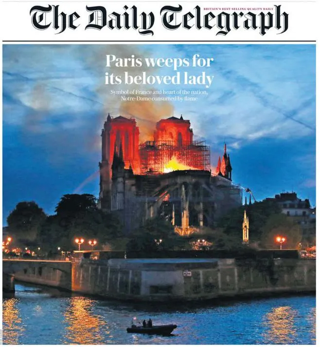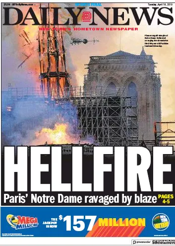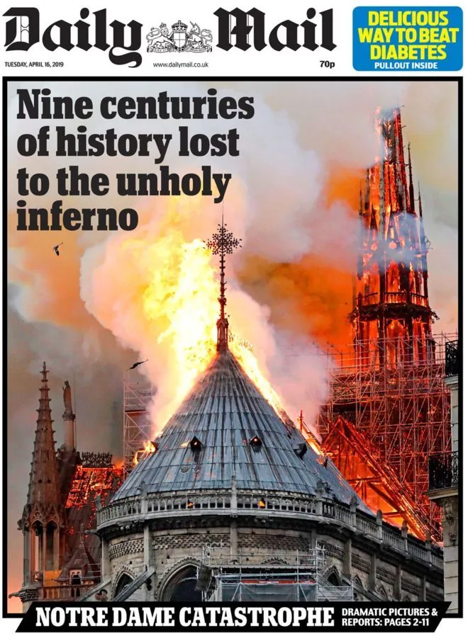 Дев'ять століть історії були втрачені в "нечистому пеклі" у Соборі Паризької Богоматері, сказано на передовиці Daily Mail, яка демонструє полум'я у верхній частині шпилів будівлі.