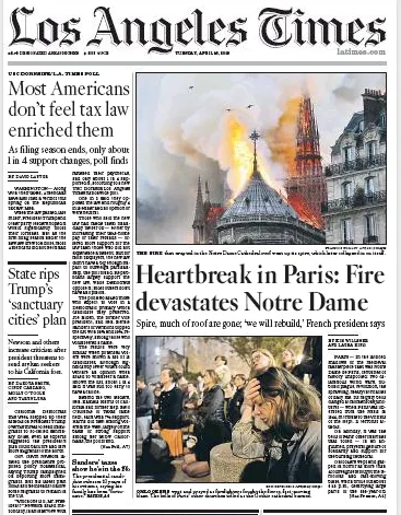 "Розбите серце Парижа: вогонь знищив Нотр-Дам", – пише LA Times. Проте цитує Еммануеля Макрона, який обіцяє, що "все відбудують".