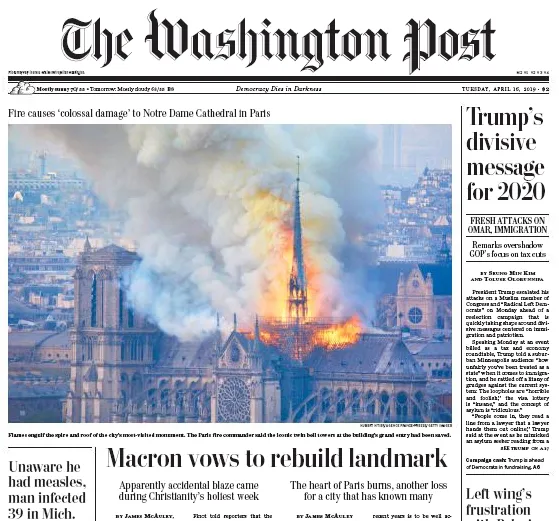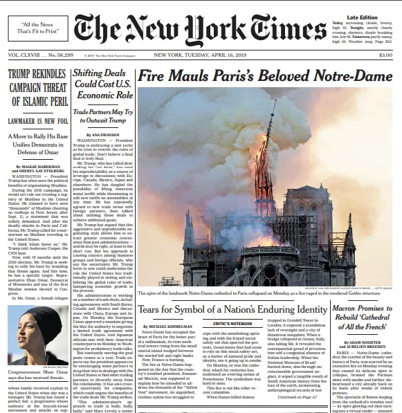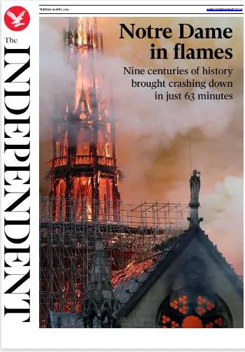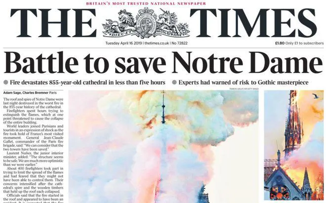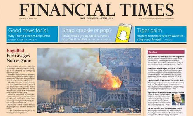 Financial Times також показує пожежу на передовиці і цитує президента Франції Еммануеля Макрона, який сказав, що це викликало "емоції усієї нації". "Я засмучений побачити цю частину нас у вогні цього вечора", – додав він.