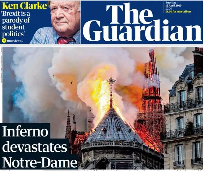 "Пекельне руйнування Нотр-Даму". The Guardian показує крупним планом один із палаючих шпилів будівлі та цитує спікера собору: "Нічого не залишиться після полум’я".