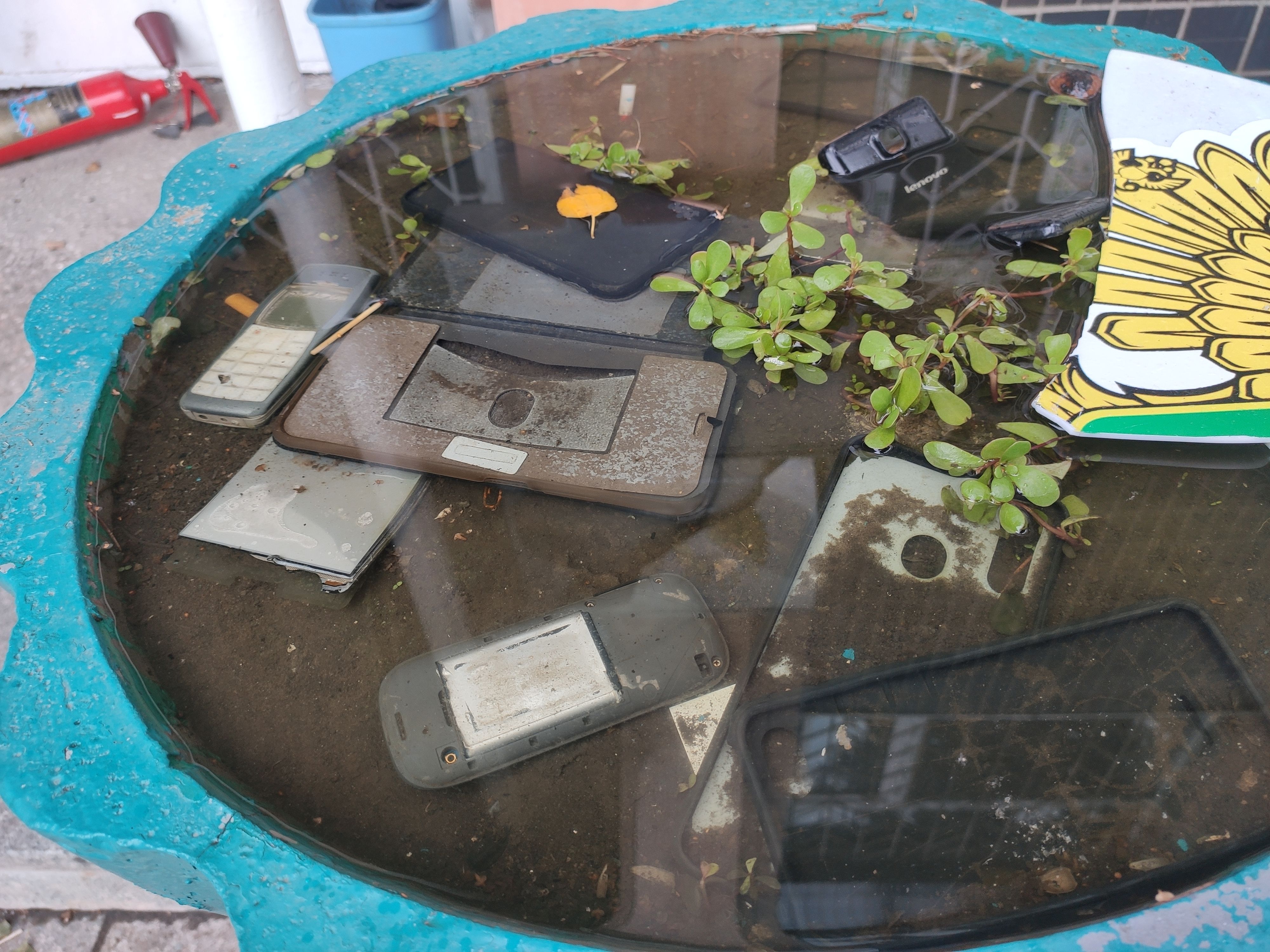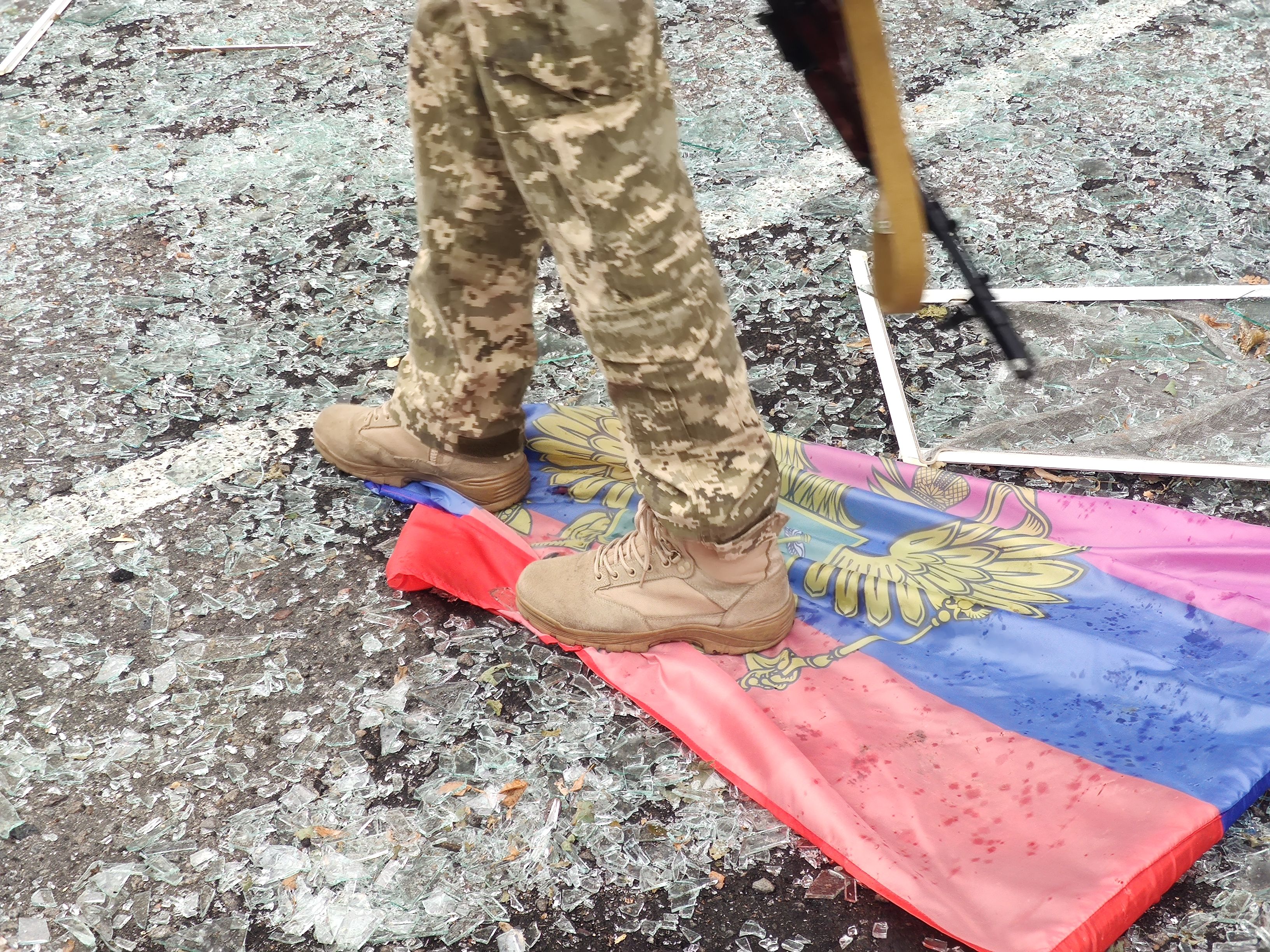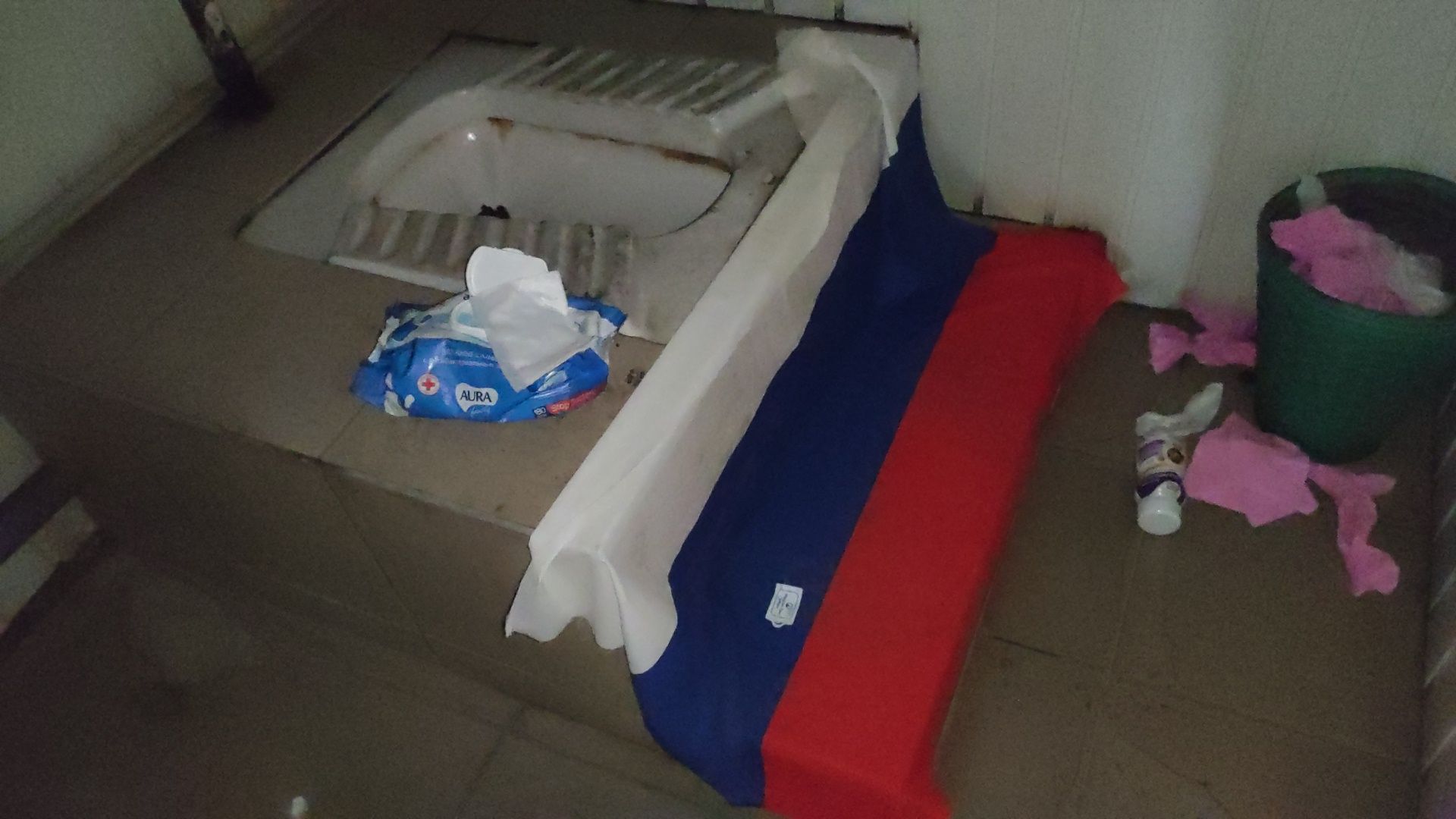 В туалете флаг россии. Вероятно, кто-то местный, кто первым после бегства россиян вошел, бросил триколор там на лестницу.