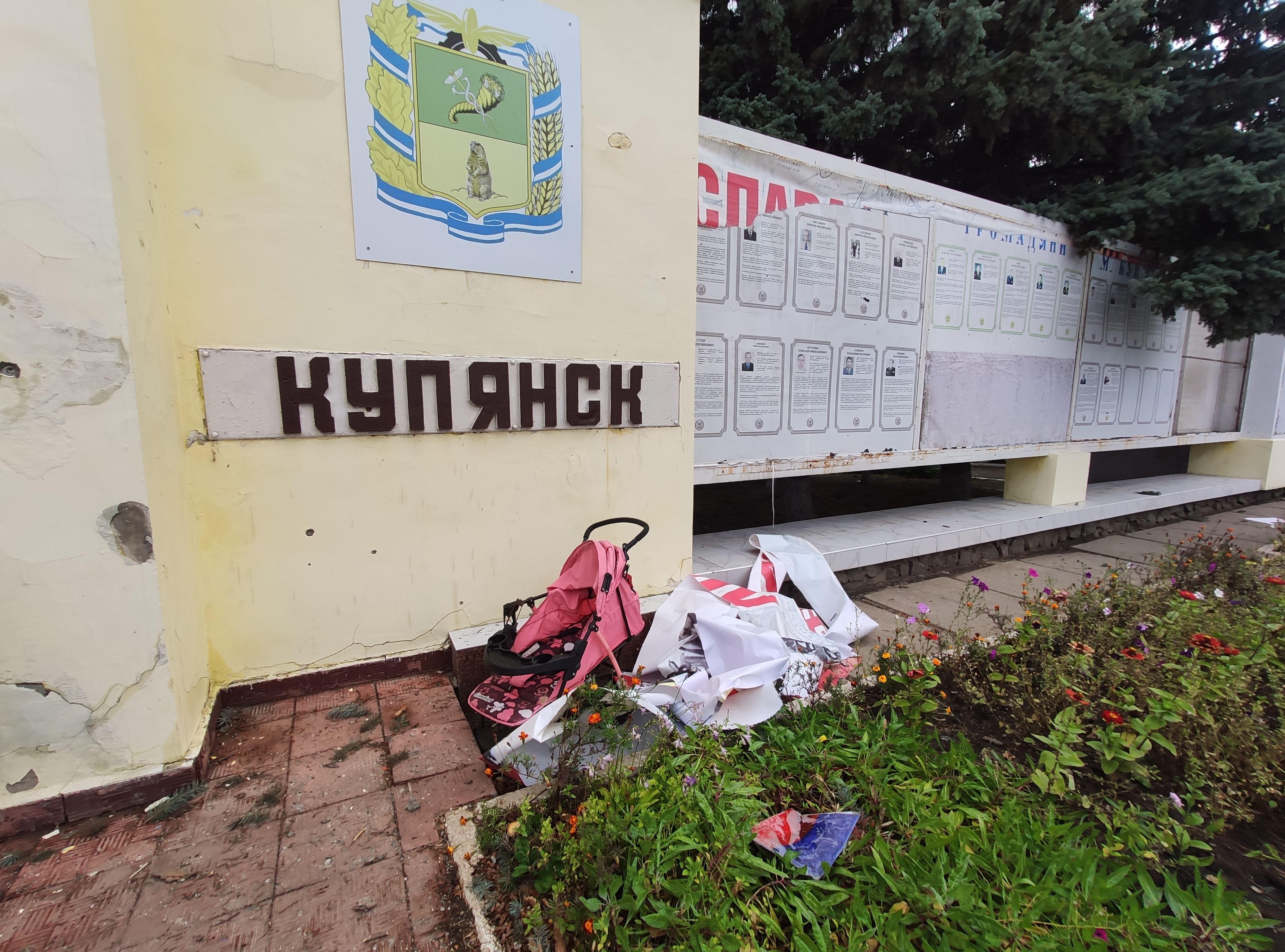 Более того, на улицах Купянска еще есть билборды с русскими надписями: "Мы с россией один народ" и подобные. Также на здании администрации остался один баннер, а остальные люди сорвали. На заднем дворе отделения полиции – валяется флаг Купянска с двуглавым орлом, который цепляли оккупанты для российских пропагандистов.