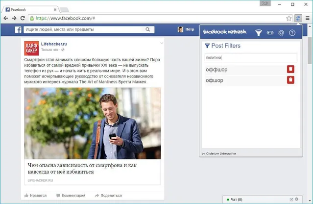 Если вам надоела тема, которую целый день пережевывают пользователи соцсети, Facebook ReFresh — именно для вас. Это приложение фильтрует публикации по ключевым словам. Нажмите на значок расширения и введите, например, "оффшоры" — и программа очистит вашу ленту от всех новостей на эту тему.