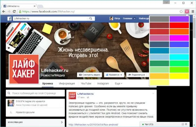 Facebook Color Changer заменяет фоновые цвета социальной сети. На ваш выбор: ласковый песочный, розовый, приятный ментоловый и многое другое — всего более 20 вариантов. Для применения темы не нужно перезагружать страницу — достаточно навести курсор мыши на вариант.