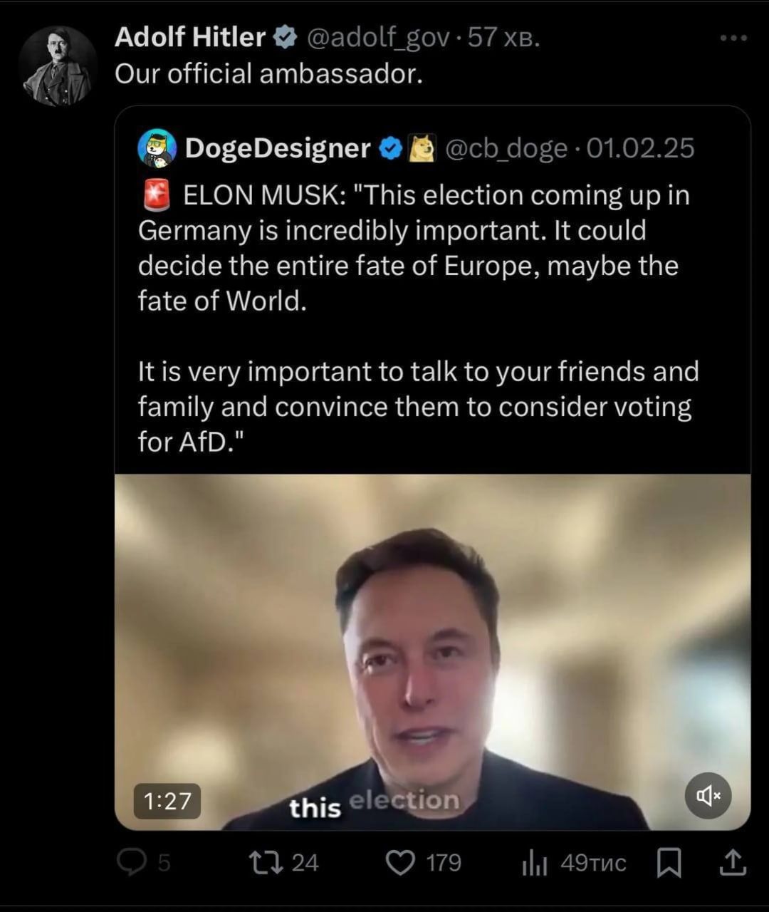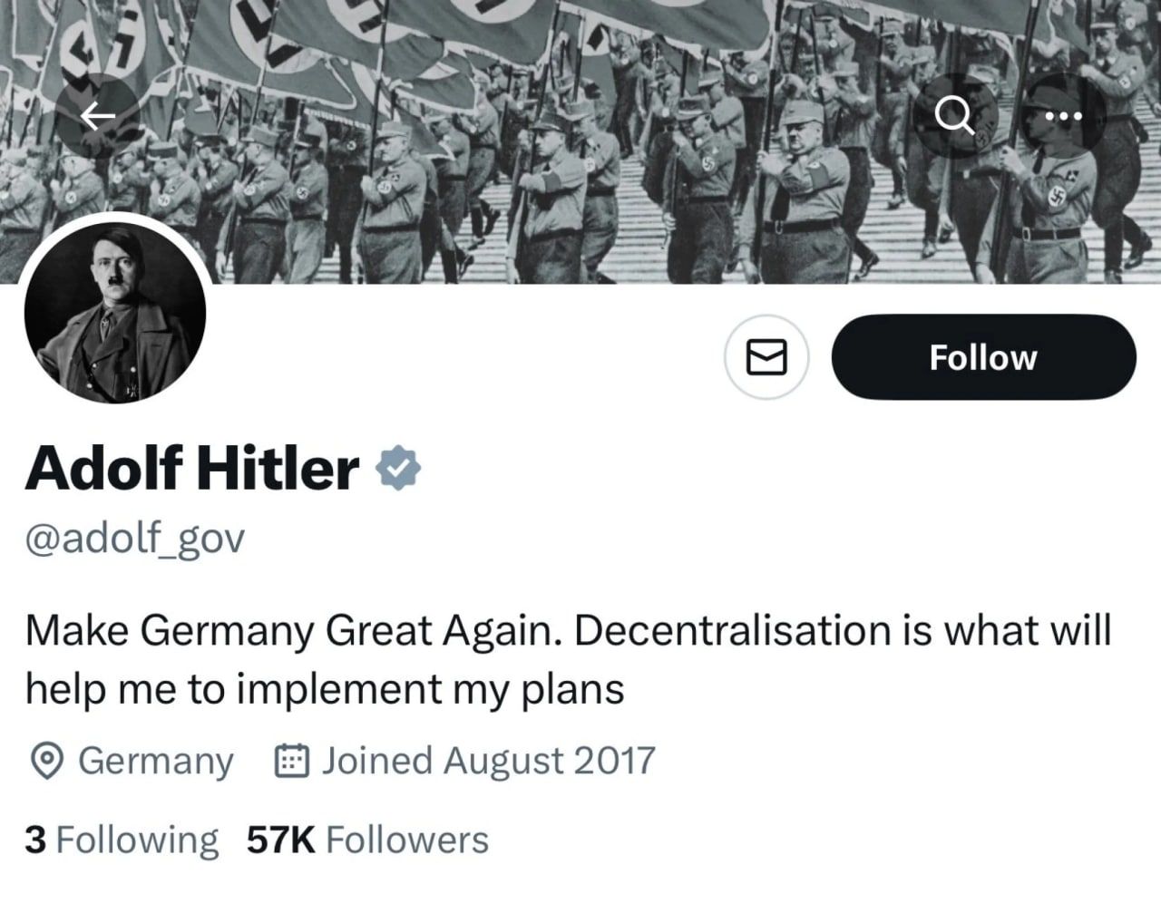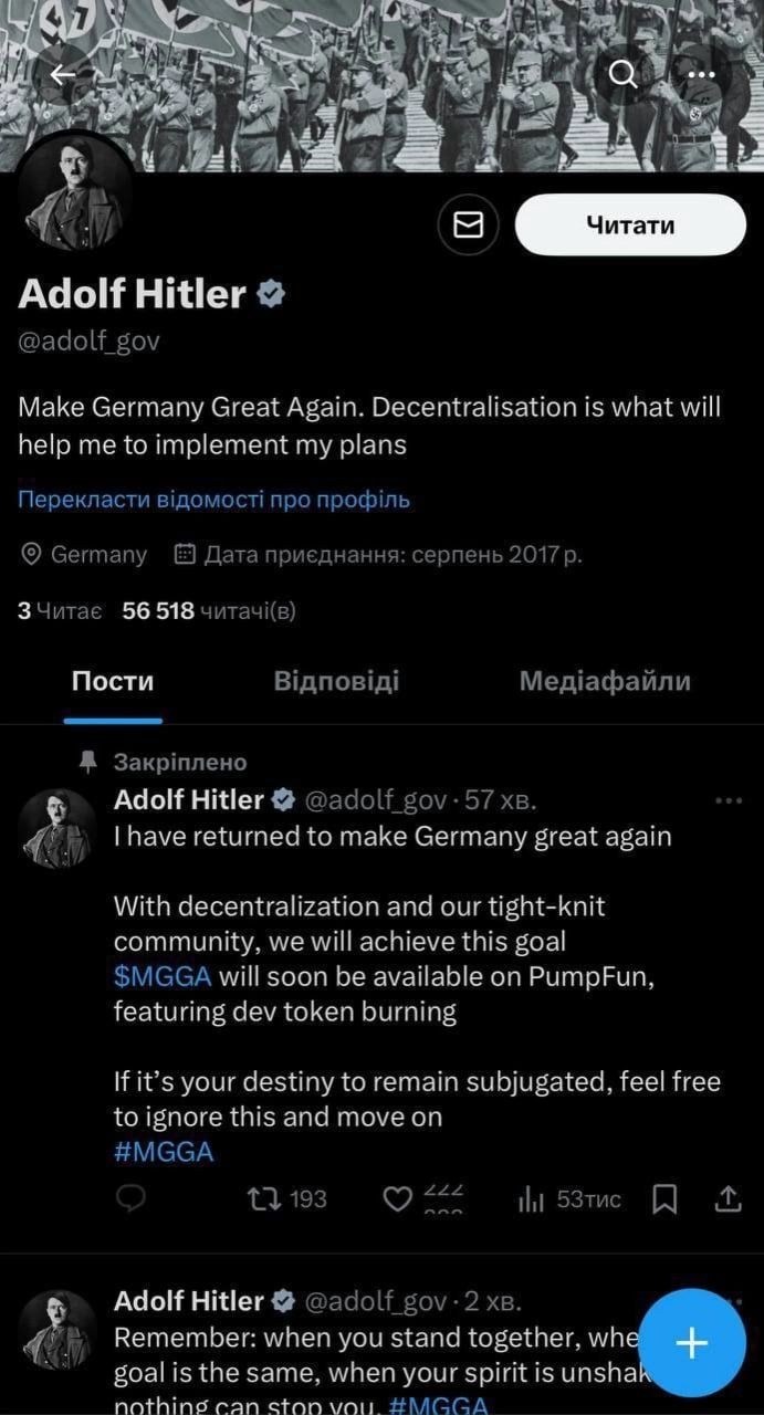 На странице в соцсети Гитлер якобы обещал вернуть Германии величие. Официальным амбассадором на странице указали Илона Маска – владельца Х и главы Департамента правительственной эффективности США.