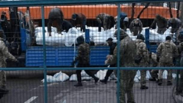 Телеканал NewsOne второй день блокировали члены партии "Братство". Въезд на канал был заблокирован колючей проволокой и мешками.