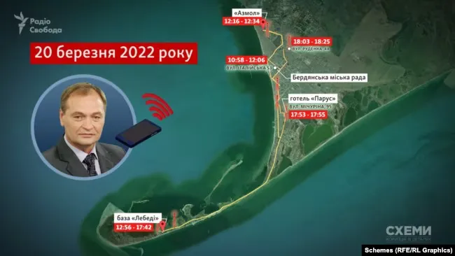 В течение следующих трех недель он активно передвигался по оккупированному городу: почти каждый день посещал собственные предприятия - "Бердянские жатки", "Азмол" и "НПП Агринол" - и вечером возвращался на базу отдыха "Лебеди". Иногда его телефон попадал в зону действия башен вблизи городского совета, где оккупанты разместили свой штаб.