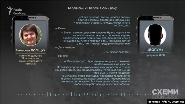 Другие перехваты телефонных разговоров "Богуна" с помощником депутата Полищуком свидетельствуют о том, что работник ФСБ и украинский нардеп нашли общий язык. Пономарев согласился запустить работу бизнеса, указание о чем передал управляющему "Агринолом" через "Богуна".