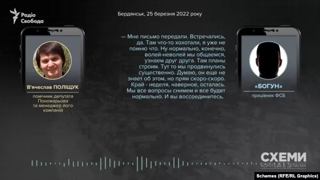 Больше света на эти события журналистам удалось пролить, получив перехват разговоров представителей оккупационных властей и окружения Пономарева, которые производили украинские спецслужбы, пока в оккупированном Бердянске еще работали украинские мобильные операторы.