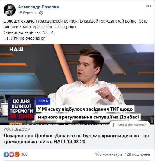 - в комментариях оправдывал агрессивную политику России, боевые действия на востоке Украины называл "гражданской войной".