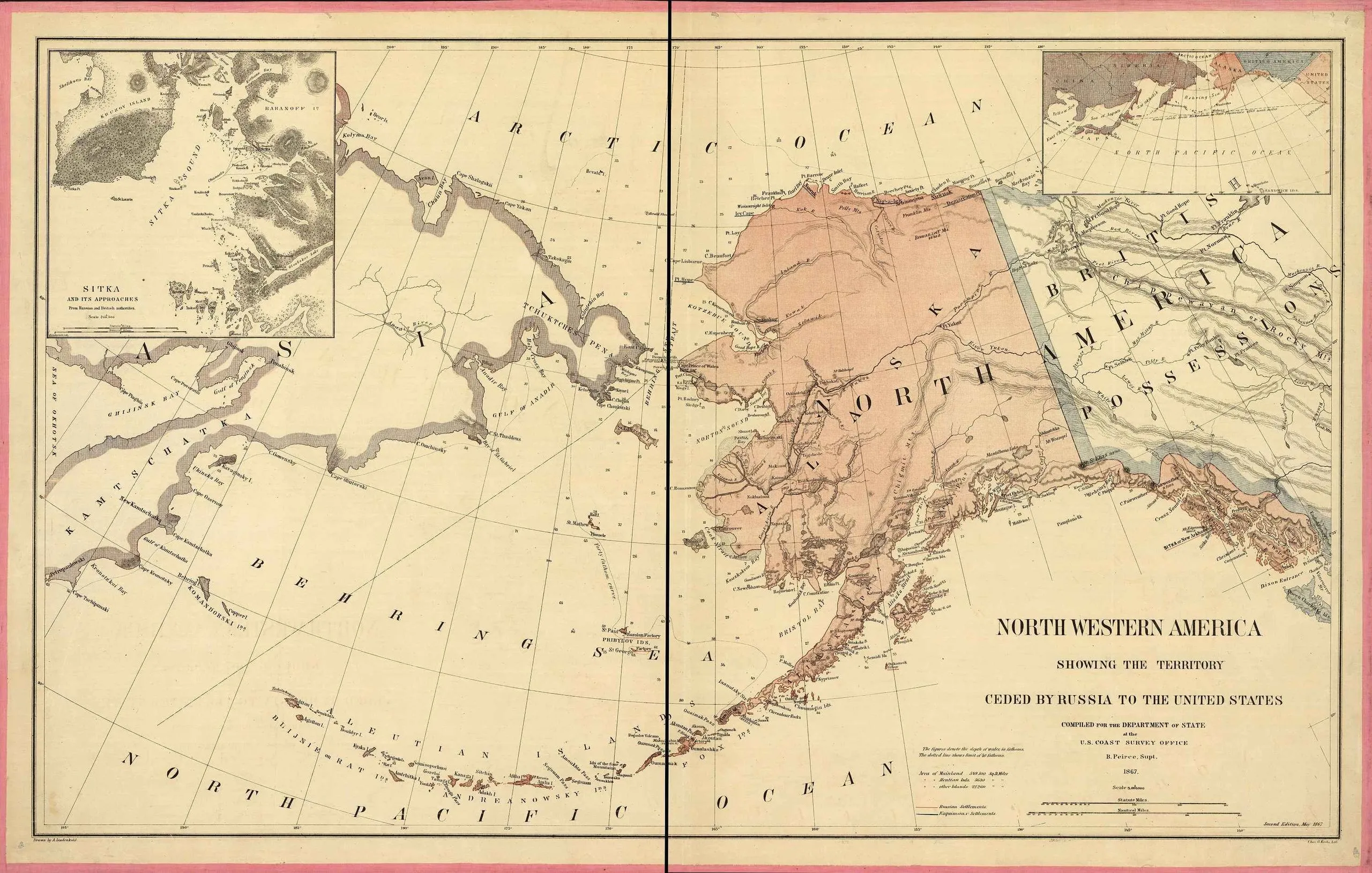 Карта Северо-Восточной Америки 1867 года с обозначением территорий, переданных Российской Империей Северо-Американским Соединенным Штатам / ллюстрация Wikimedia