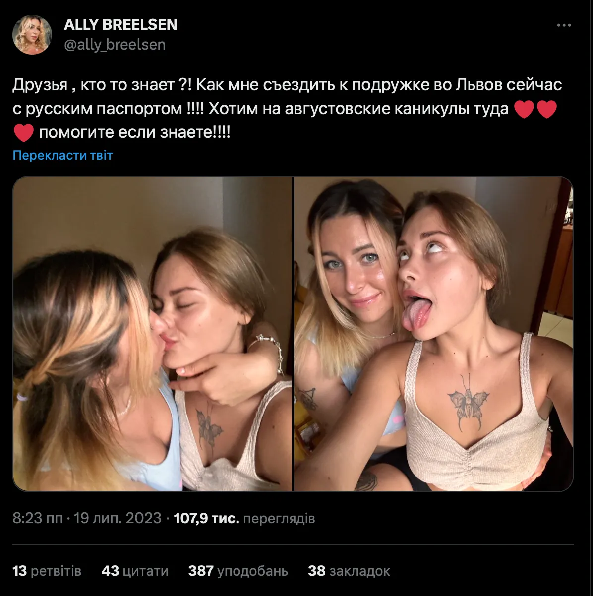 Кстати, точку в ее желании попасть во Львов поставил один из пользователей сети. Он написал порнозвезде, что в Украине разрешили убивать россиян. Ally Breelsen это не на шутку испугало, поэтому она решила отложить визит.