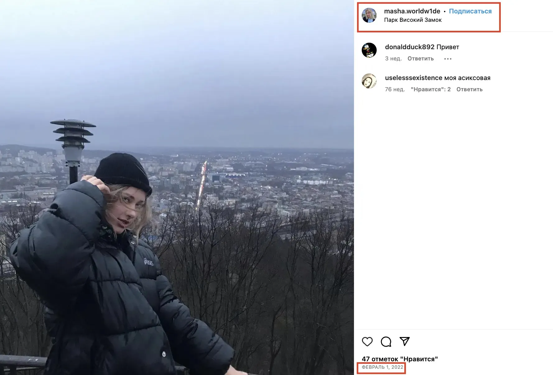Подруга россиянки делала фото на Высоком замке во Львове / Скриншот с ее страницы