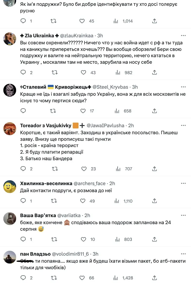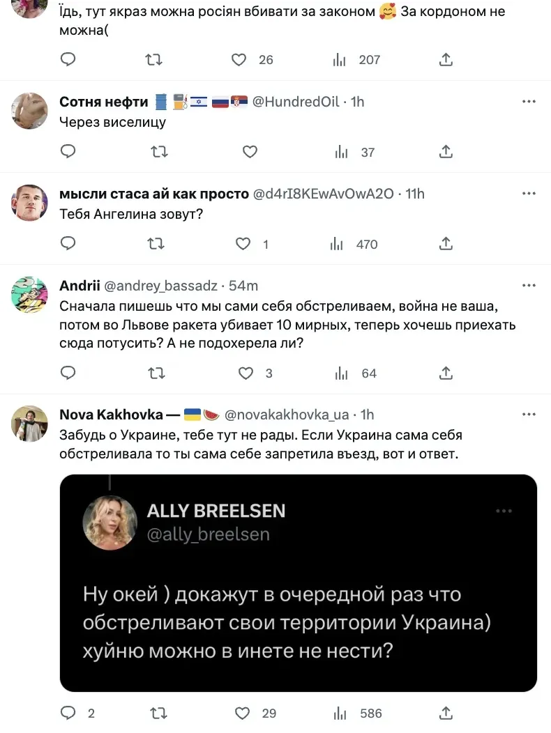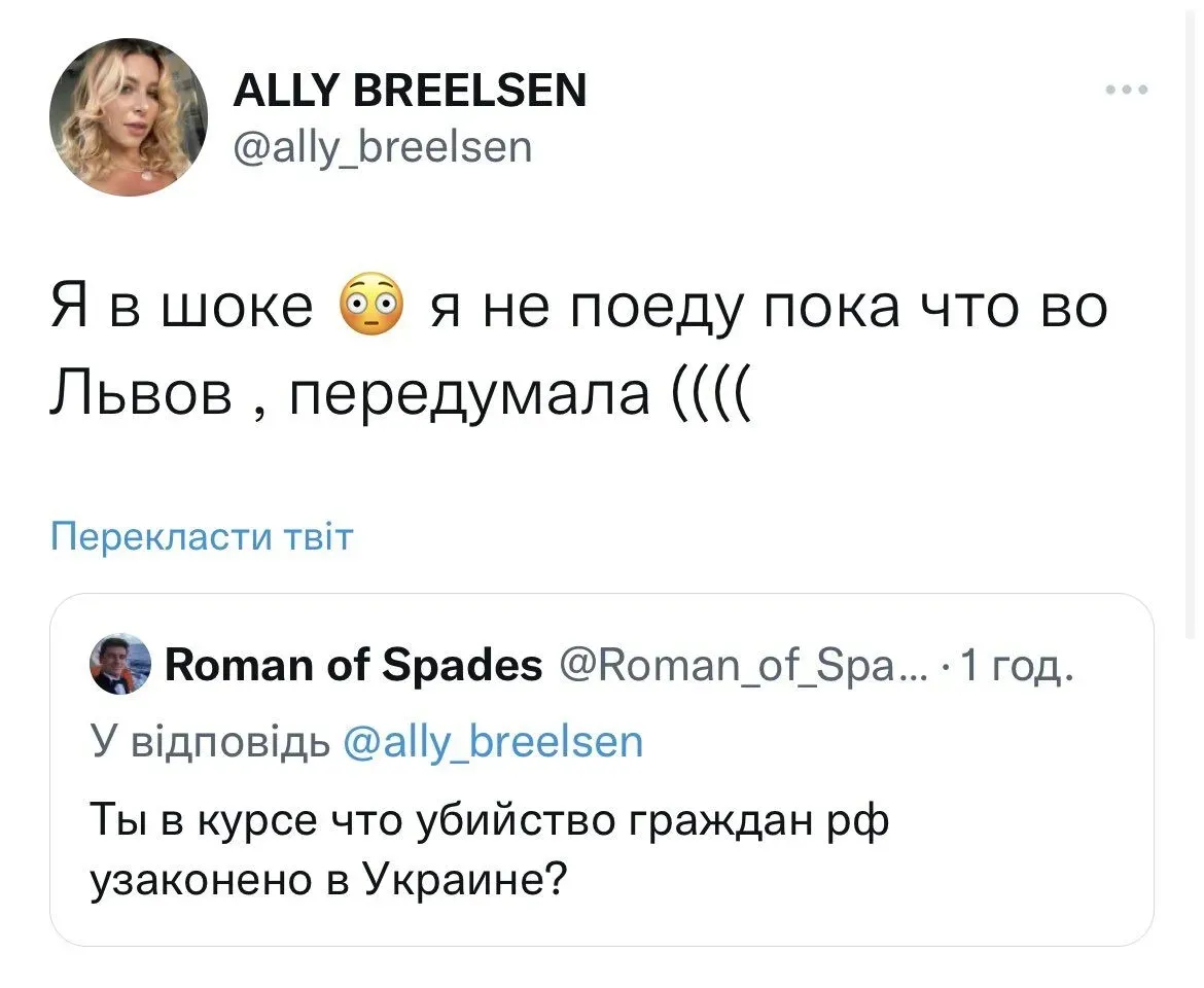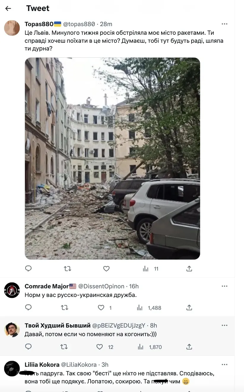 - "Это Львов. На прошлой неделе Россия обстреляла мой город ракетами. Ты действительно хочешь поехать в этот город? Думаешь, тебе здесь будут рады, ш***а ты г***ая?",